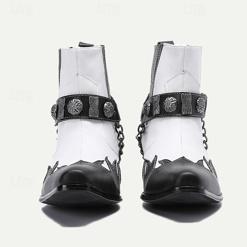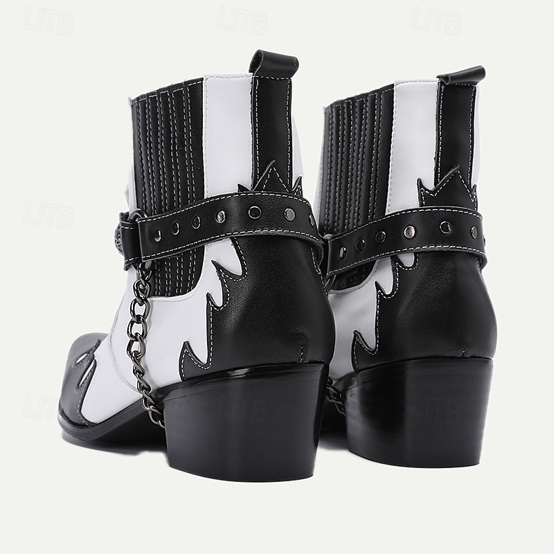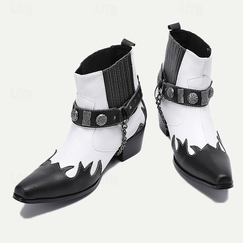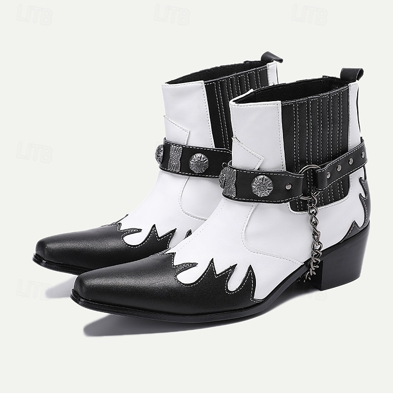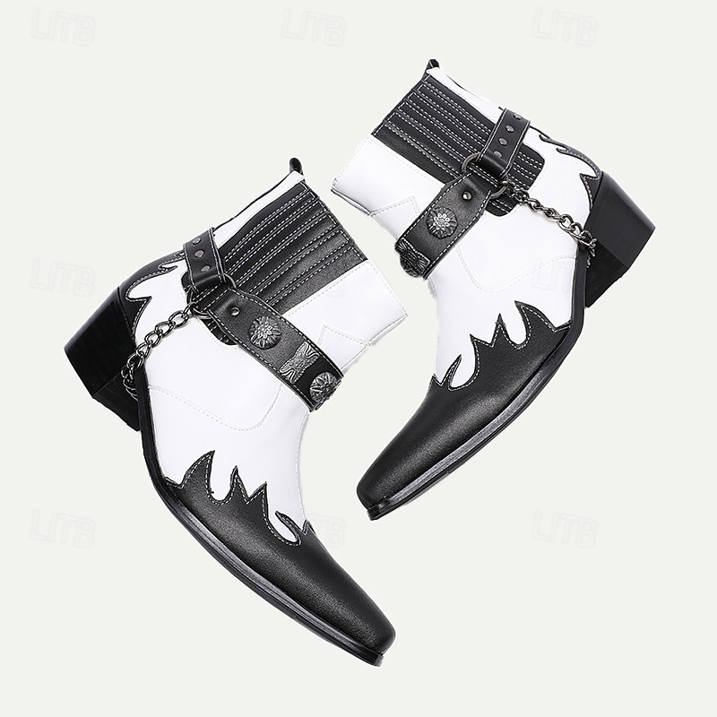 Highlights [Product Title] : Men's Premium Cowhide Black and White Motorcycle Boots with Studded Strap and Chain Detail – Perfect for Riding and Casual Wear [Fabric] : Crafted from 100% premium Italian full-grain cowhide leather, these boots deliver both durability and a high-end feel. The leather lining further adds to the luxurious comfort. [Fit] : Featuring a classic cowboy boot silhouette, these boots have a pointed toe and mid-height heel. Side elastic panels offer a comfortable fit and ensure ease of wear, marrying style with practicality. [Design Highlights] : The boots boast a striking black and white contrast with flame-like patterns on the toe, showcasing an edgy, stylish edge. Decorative metallic embellishments and a chain detail around the ankle enhance the bold aesthetic, while a secure buckle closure adds to the utility. [Occasions] : Ideal for riding, casual outings, and any event where you want to make a statement. Their retro and biker style encapsulates both functionality and fashion, making them suitable for various occasions. [Size Range] : Available in a comprehensive range of sizes from US6 / EU39 / UK5 to US13 / EU46 / UK12, ensuring a suitable fit for diverse preferences and needs.