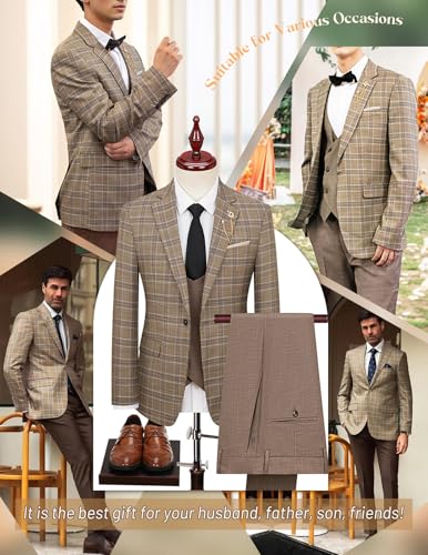 Mens 3 Pieces Plaid Suit Slim Fit Tuxedo Blazer Vest Pants for Wedding Prom Homecoming with Brooch Pin 3