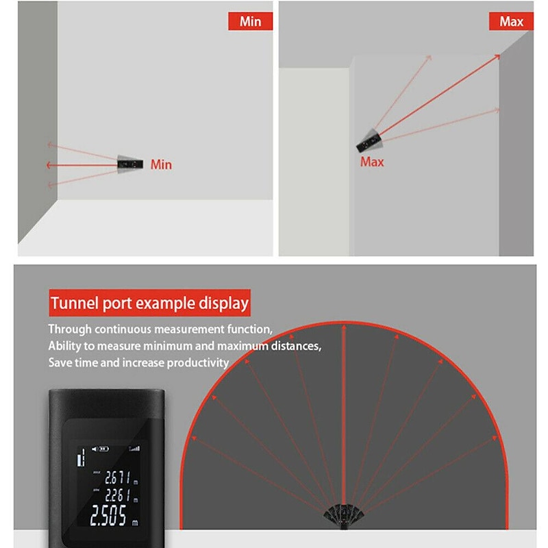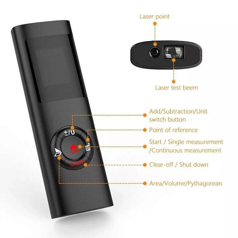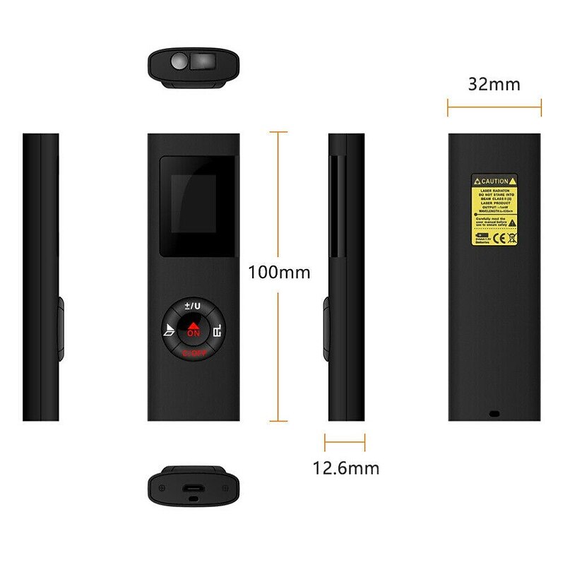 Highlights 1. USB RECHARGEABLE - No more worrying about batteries! 2. INTELLIGENT COMPUTING & HIGHER ACCURACY - The laser distance meter automatically calculates and comes with error reporting technology for more accurate readings. Plus, you can freely switch between M / In / Ft units and achieve ±1/16 inch accuracy with a measurement range of up to 98ft (30m). 3. WIDE APPLICATION - With multiple measurement modes like distance, volume, area measurement, continuous measurement, and Pythagoras, this laser level is perfect for home, construction, and industrial use. It's especially useful for large areas such as rooms, apartments, buildings, real estates, factories, and warehouses. 4. PORTABLE & COMPACT - At only 29g, this laser distance meter is easy to carry around. Its compact and handy design provides a comfortable operating experience. Plus, the LCD with a back light makes it easy to read even in low-light conditions.