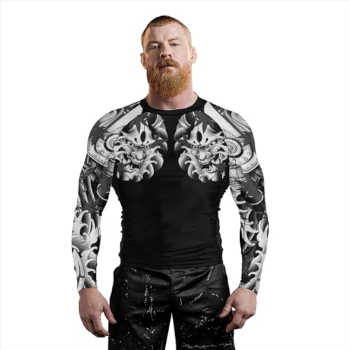 Fabric type: 85% Polyester, 15% SpandexCare instructions: Machine WashOrigin: ImportedNeck style: Crew NeckBENDABLE CONSTRUCTION: Constructed from 85% Polyester and 15% Spandex blend that bends and moves freely with you for unrestricted mobility.MOISTURE WICKING CONTROL: Quick-dry fabric actively pulls sweat away from skin keeping you cool and dry during intense intense training in this mens jiu jitsu rash guard.FADE-RESISTANT PRINTS: Innovative printing technology keeps the unique, eye-catching graphics on this compression rash guard vividly colored and resistant to fading.LIGHTWEIGHT STREAMLINED ATHLETIC FIT: The ergonomic slim fit silhouette of BJJ samurai ranked rash guard feels lightweight and enables full mobility perfect for combat sports.COMFORT & VERSATILITY ACROSS SPORTS: Performs excellently during MMA, BJJ, Jiu-Jitsu, No-Gi Grappling, Muay Thai, Gym and more activitiesm in this compression shirt. Perfect for everyday use. High quality materials and excellent craftsmanship ensure long-lasting durability.