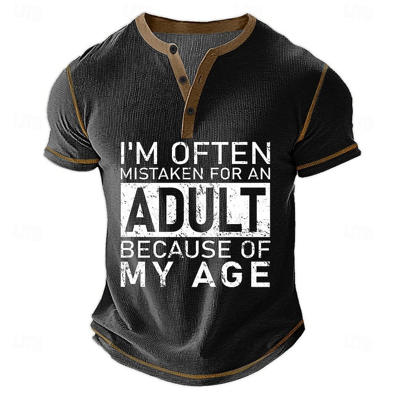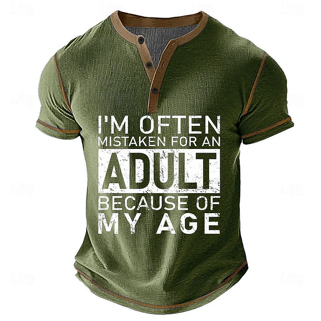 Men's Funny 'I'm Often Mistaken for an Adult Because of My Age' Graphic Short Sleeve Henley T-Shirt, Ribbed Casual Top 11