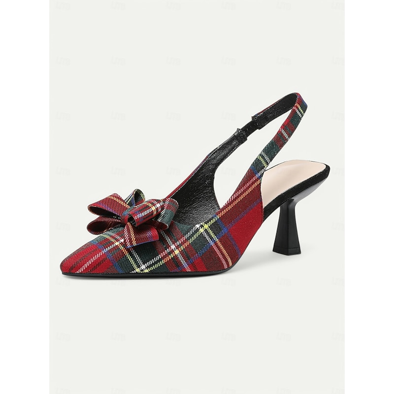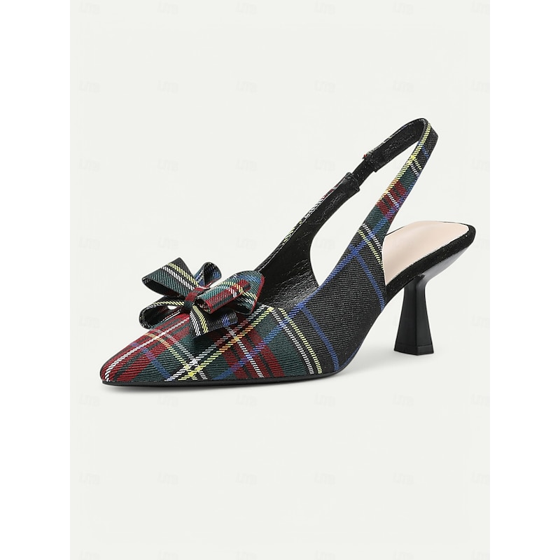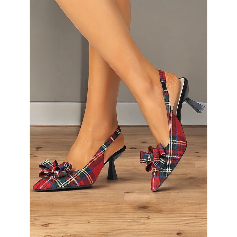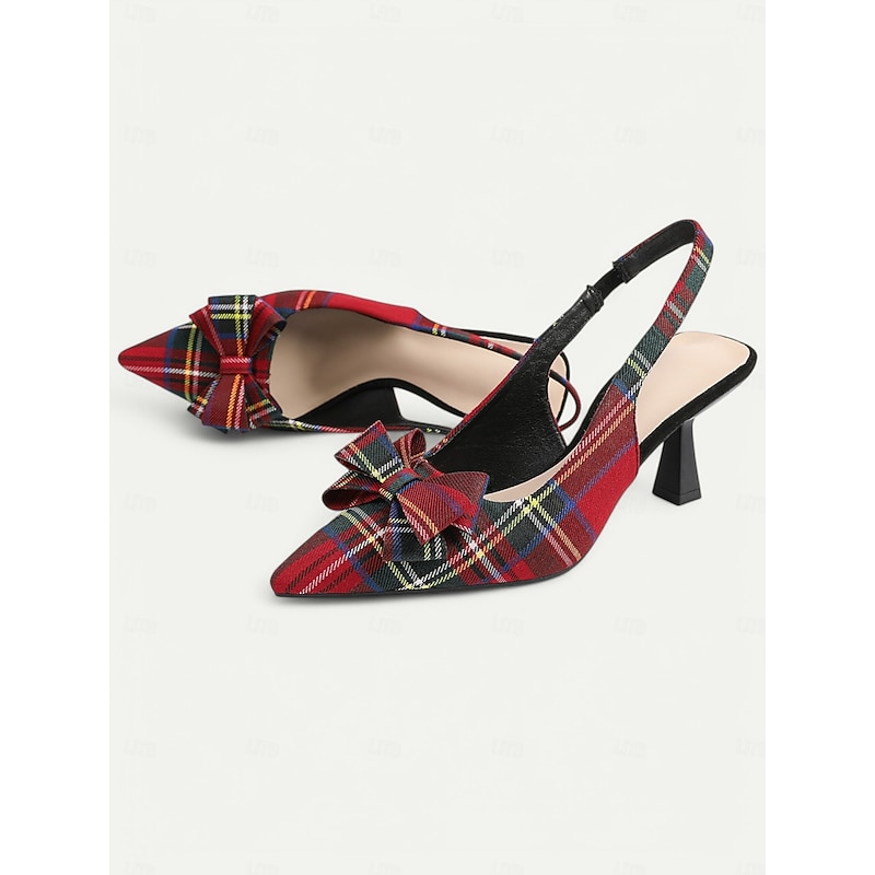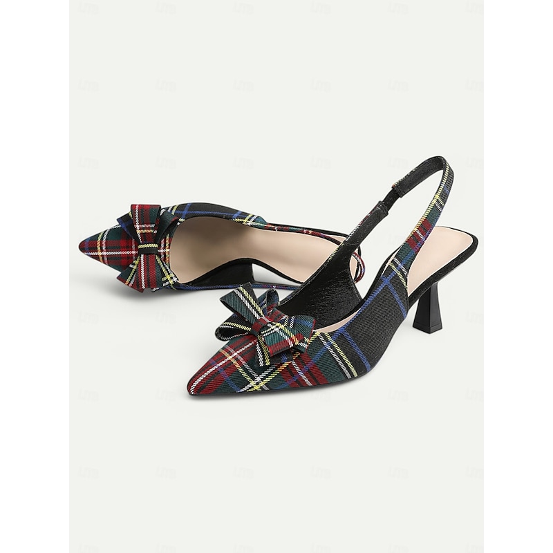 HOT ! Women's Tartan Plaid Slingback Heels – Pointed Toe Kitten Heels with Bow Detail, Elegant Pumps for Parties & Office Wear