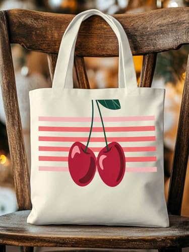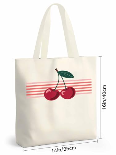 HOT ! Canvas Tote Bag Red Cherry with Stripes Reusable Grocery Shopping Bag,Shoulder Tote Bags for Women Vacation Travel Work Gym