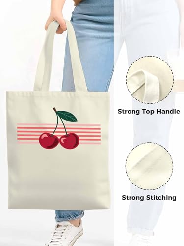 Canvas Tote Bag Red Cherry with Stripes Reusable Grocery Shopping Bag,Shoulder Tote Bags for Women Vacation Travel Work Gym 1