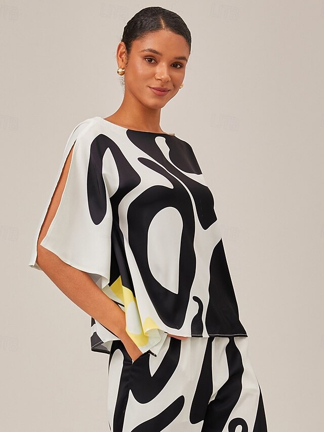 HOT ! Women's Satin Silk Shirt Color Combo Casual Daily Magyar Sleeve Black Ladies Flowy Graphic Half-Sleeve Casual Daily Bateau Spring & Fall Cross-Seasons