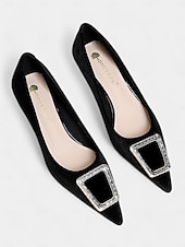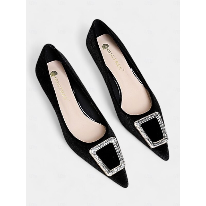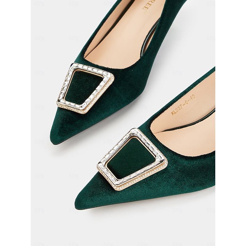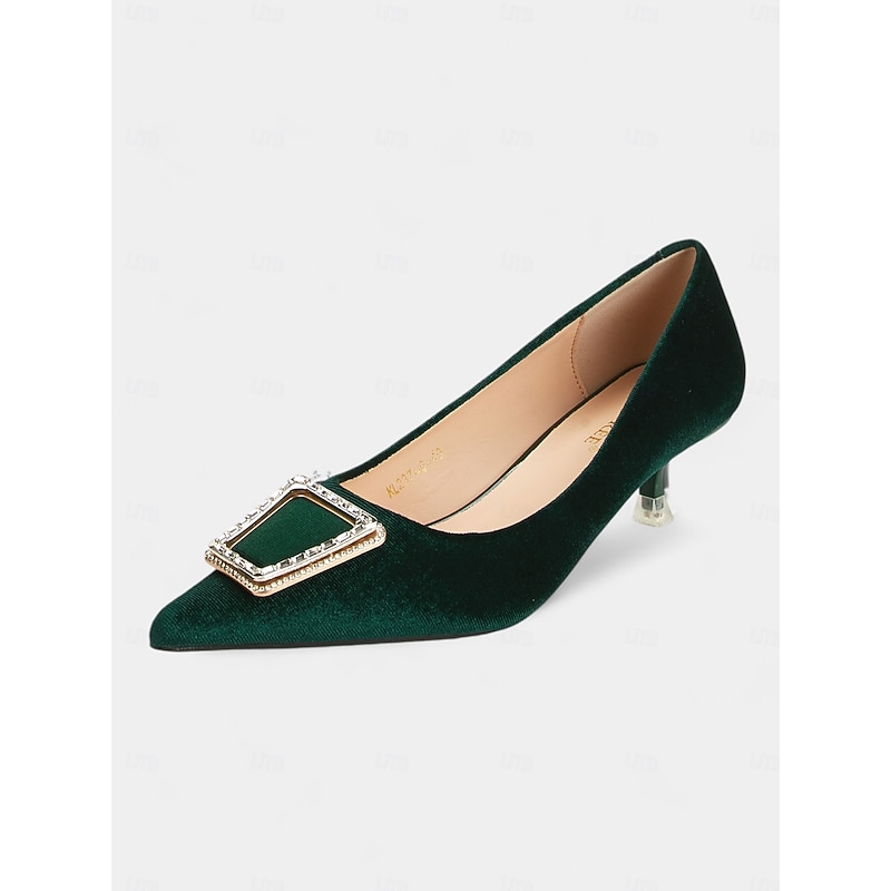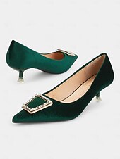 Highlights [Fabric] : Crafted from luxurious emerald green velvet, these women's shoes offer a rich and sophisticated appearance. The high-quality velvet material ensures both elegance and comfort, making these heels a stylish addition to any wardrobe. [Silhouette] : Featuring a classic pointed toe design, these elegant pumps highlight a timeless silhouette complemented by a refined kitten heel. This low heel design offers both comfort and style, ideal for long wear during any occasion. [Design Highlights] : These shoes are adorned with a beautifully embellished rhinestone buckle on the upper section, adding a touch of glamour and sparkle. The smooth faux leather lining enhances comfort, while the sturdy rubber sole provides excellent grip and stability for confident steps. [Occasions] : Perfect for formal events, parties, and a variety of special occasions, these pumps bring an elegant flair to any outfit. Whether for a sophisticated dinner or a stylish day out, these shoes ensure you look chic and polished. [Size Suggestion] : Available in a range of standard sizes, from US5.5/EU35 to US10.5/EU42, ensuring a perfect fit by selecting your usual size for added comfort and confidence.