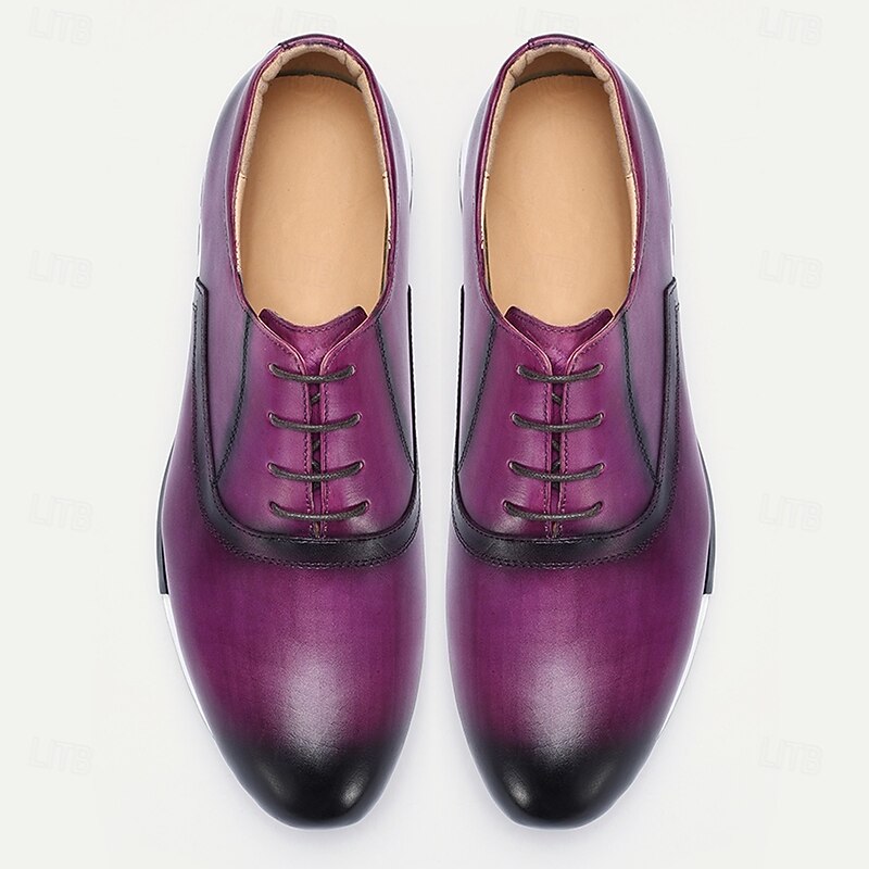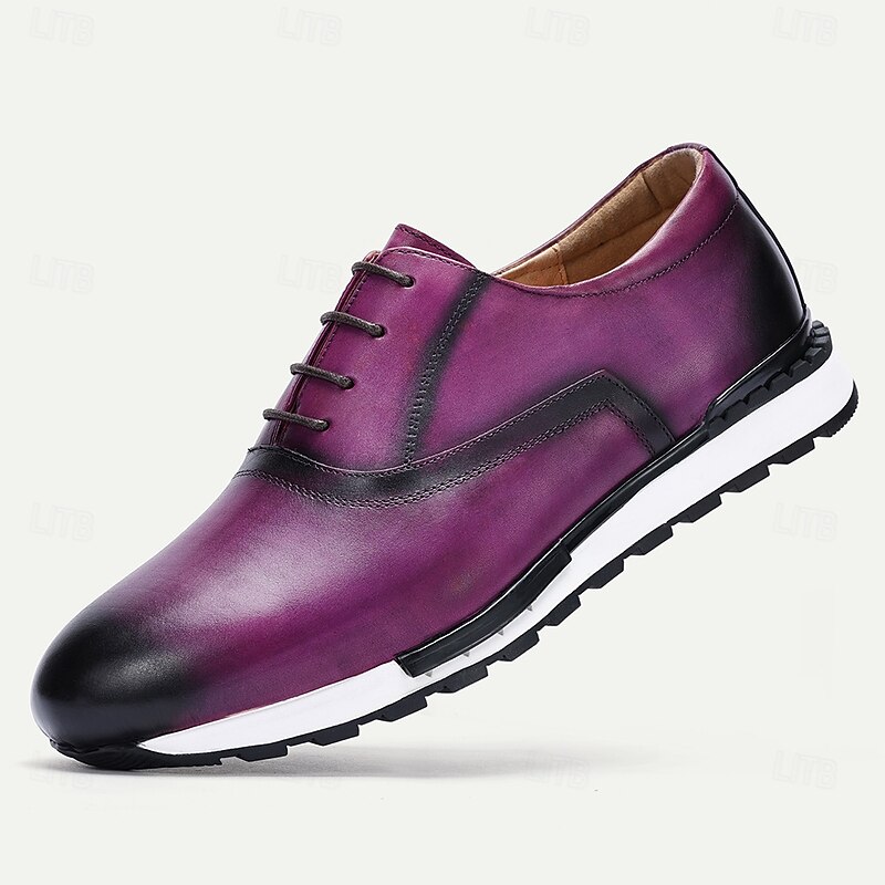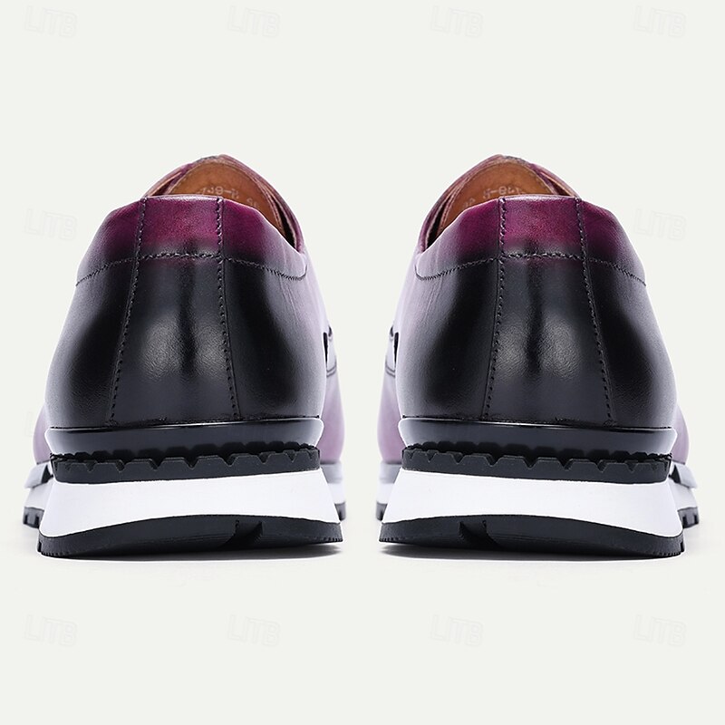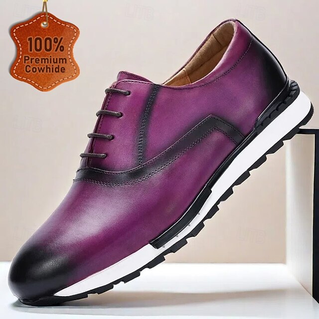 Highlights [Fabric] Crafted from 100% premium Italian full-grain cowhide leather, these sneakers offer a luxurious feel and unmatched durability. The high-quality leather ensures longevity while providing a sleek and polished finish for a sophisticated appearance. [Fit] Featuring a classic lace-up closure, these shoes provide a snug and adjustable fit for maximum comfort. The round toe design adds to the overall comfort, making them suitable for all-day wear. [Design Highlights] The vibrant purple color with elegant black accents lends a bold yet refined look, perfect for making a statement. The cushioned insole enhances comfort, while the slip-resistant rubber outsole ensures stability and excellent traction. [Occasions] Ideal for both casual and business casual settings, these shoes elevate your style whether you're at a weekend brunch or a semi-formal office event. They seamlessly combine comfort and style, making them a versatile addition to any wardrobe. [Size Range] Available in a wide range of sizes to fit US6 to US13, these sneakers cater to a variety of foot sizes, ensuring that you find the perfect fit for maximum comfort and style.