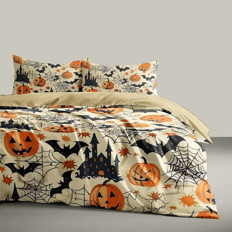 HOT ! Halloween Beige Duvet Cover Set - Adorable Pumpkin Print to Decorate Your Bedroom - Includes Duvet Cover and Pillowcases - Soft and Cozy Fabric - Perfect for Adding Festive Charm to Your Space