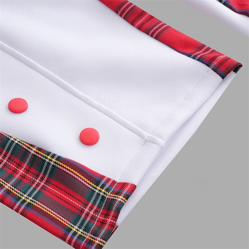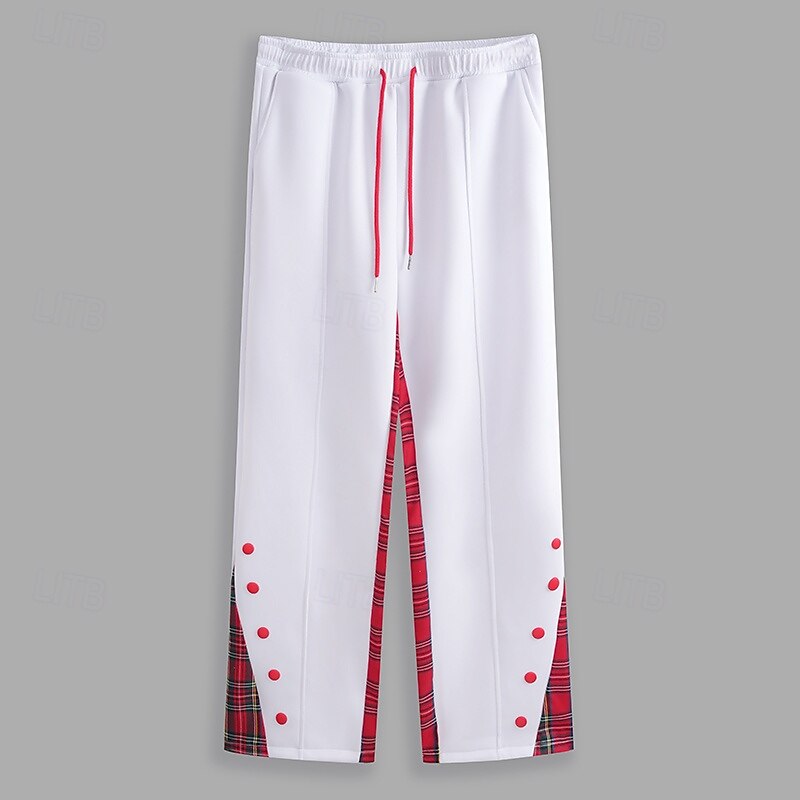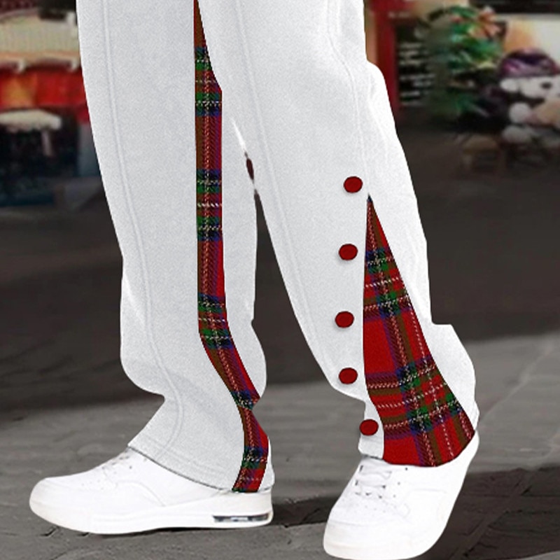 Highlights [Fabric]: Crafted with premium polyester, these men's joggers offer comfort and breathability, making them perfect for a range of activities. The smooth texture ensures a soft feel against the skin, providing all-day comfort. [Fit]: Designed with a regular fit, these trousers provide a contemporary look while ensuring ease of movement. The straight-leg silhouette is both stylish and versatile, suitable for various body types. [Design Highlights]: Featuring striking plaid patchwork on the side panels, these joggers add a touch of classic elegance to your wardrobe. The decorative red buttons bring a unique flair, while the drawstring elastic waist allows for a personalized and adjustable fit. [Occasions]: Ideal for the holiday season, these joggers are perfect for Christmas gatherings, daily outings, and sports activities. Pair them with your favorite sneakers for a casual yet fashionable look, suitable for both leisure and festive occasions. [Size Range]: Available in a wide range of sizes from S to 3XL, these sweatpants cater to diverse body shapes, ensuring a comfortable fit for everyone.