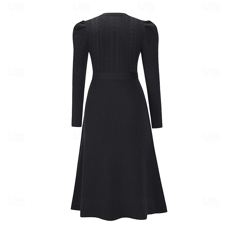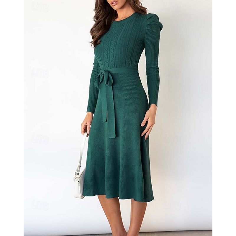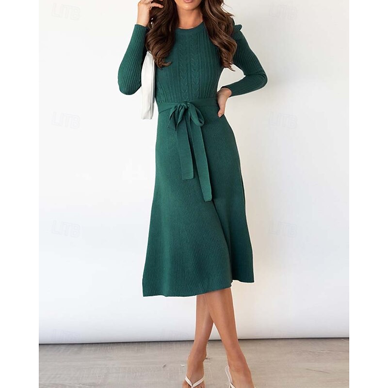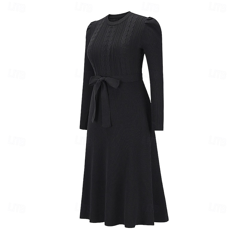 Highlights [Fabric] : Crafted from high-quality polyester, this women's sweater dress features a ribbed knit texture that offers micro-elasticity for a comfortable and flexible fit. The material is perfect for keeping warm in the fall and winter seasons. [Silhouette] : The dress boasts a flattering regular fit design with a round crew neckline and long sleeves, providing both elegance and a timeless silhouette. The ribbed knit fabric ensures a stylish fit that adds sophistication to any outfit. [Design Highlights] : A key design feature of this dress is its waist tie belt, which accentuates your waistline, bringing a feminine and chic touch to the ensemble. The solid color pattern enhances the classic and versatile nature of the dress, making it easy to accessorize. [Occasions] : This elegant sweater dress is suitable for a variety of settings, including daily wear and work environments. Whether you're headed to the office, a casual outing, or a formal gathering, this dress offers the perfect blend of style and practicality. [Size Options] : Available in four sizes - S, M, L, and XL - this dress caters to a range of body types, ensuring a comfortable and flattering fit for everyone.