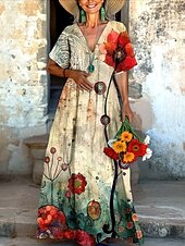 More information about Women's Long Dress Maxi Dress Casual Dress Summer Dress Boho Dress Vintage Vacation Daily Weekend Regular Fit Floral Color Block Short Sleeve V Neck Red Green Summer