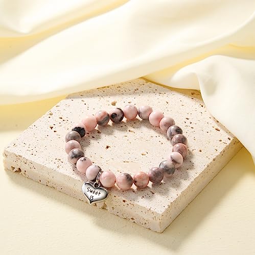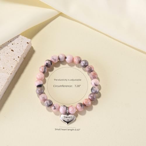 • *Pink Zebra Jasper Stone Bracelet* The beads of the bracelet are made of natural bean paste-colored stones that each stone beads have a unique color and pattern. The sweet 13 heart charm is made of stainless steel. Simply close your eyes and make a wish, then tie this bracelet on your wrist, when it falls off or wears through, legend says that your wish will come true.