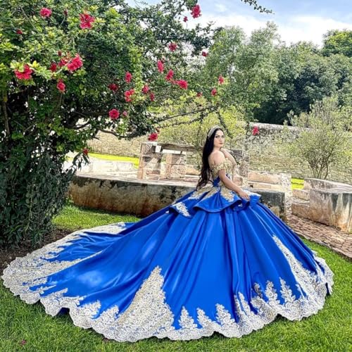 • ★Design:Luxury satin quinceanera dresses long ball gown, puffy/layered/satin/off shoulder/with train/layered/applique/Layered/gold lace, back up closure, it is easier for us adjust the bust size.