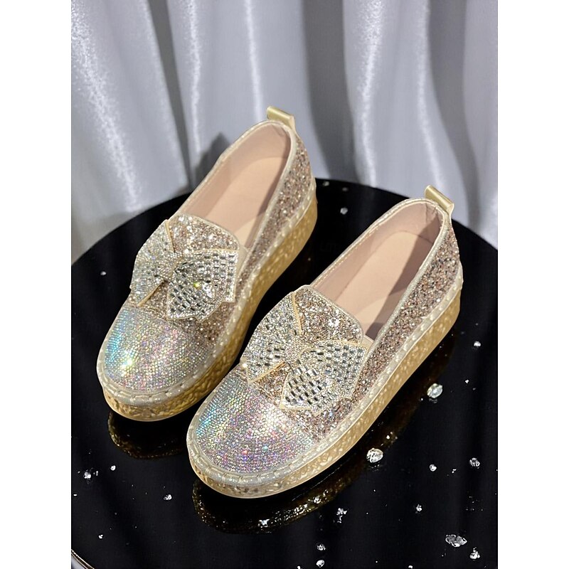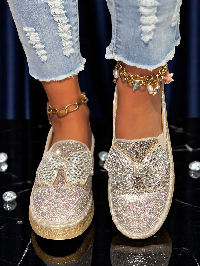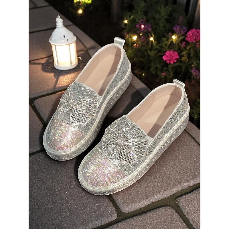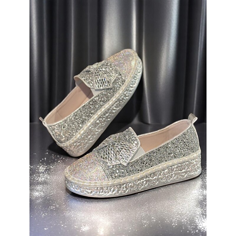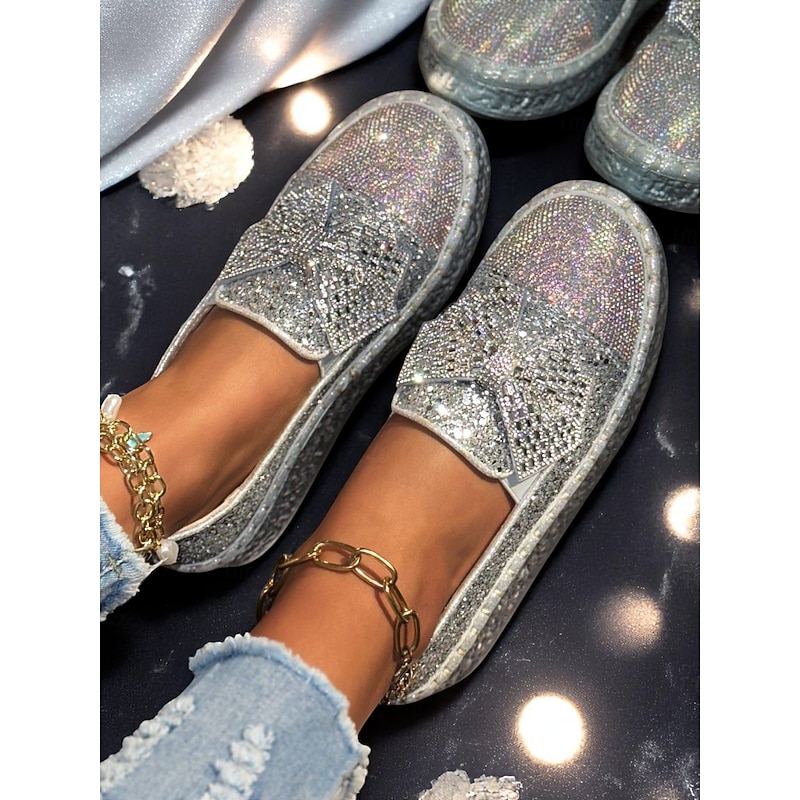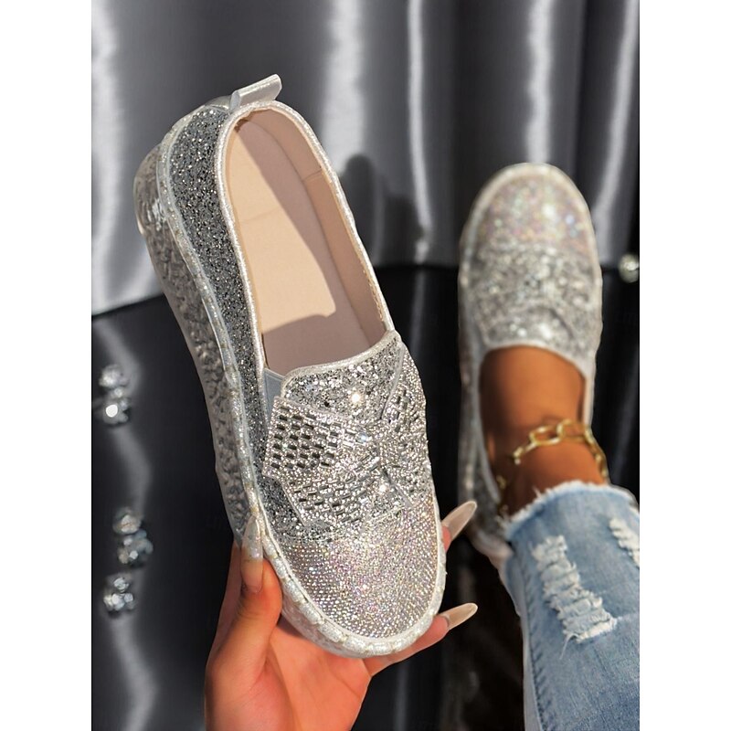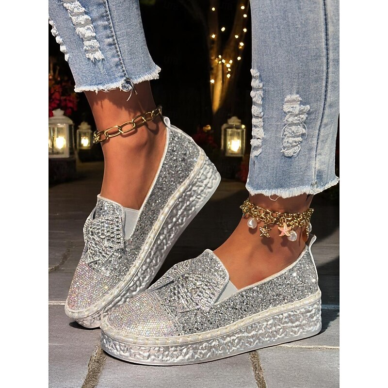 HOT ! Women's Silver Glitter Platform Slip-On Shoes— Rhinestone Embellished, Cushioned Sole, Party-Ready Sparkle for Night Out, Festivals and Concerts