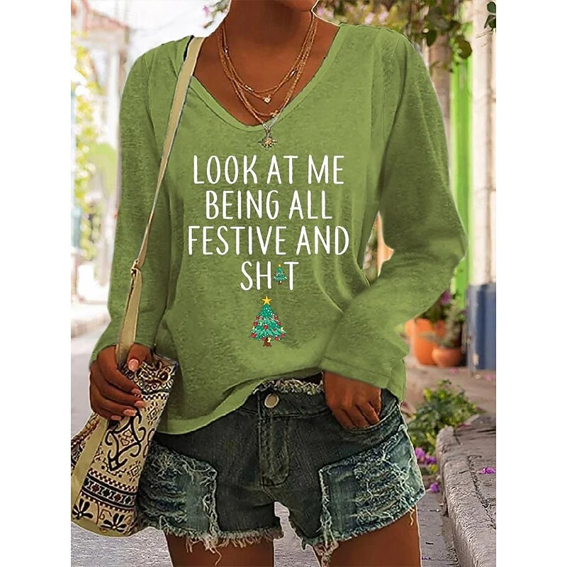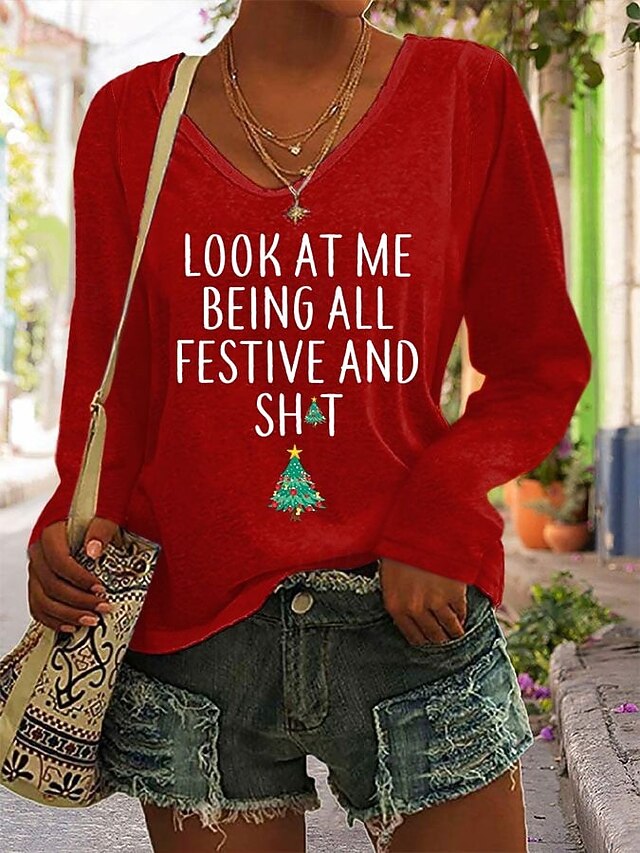 HOT ! Christmas Women's T Shirt Graphic Christmas Tree Letter Vintage Stylish Classic Long Sleeve V Neck Regular Tops Daily Print Black White Pink Red Green Spring Fall Winter