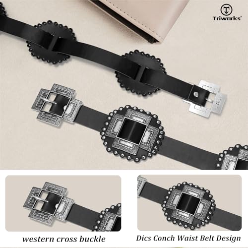 • Cowgirl Belt Size Note: Our black western boho belt suit for pant's width 2.7'', leather belt strap width is 1'', cross disc decoration is 2.7"*3", pin buckle is 2.2"*2.7". Our brown western belt fits most people's waistline, you can choose the right size according to your actual waistline.