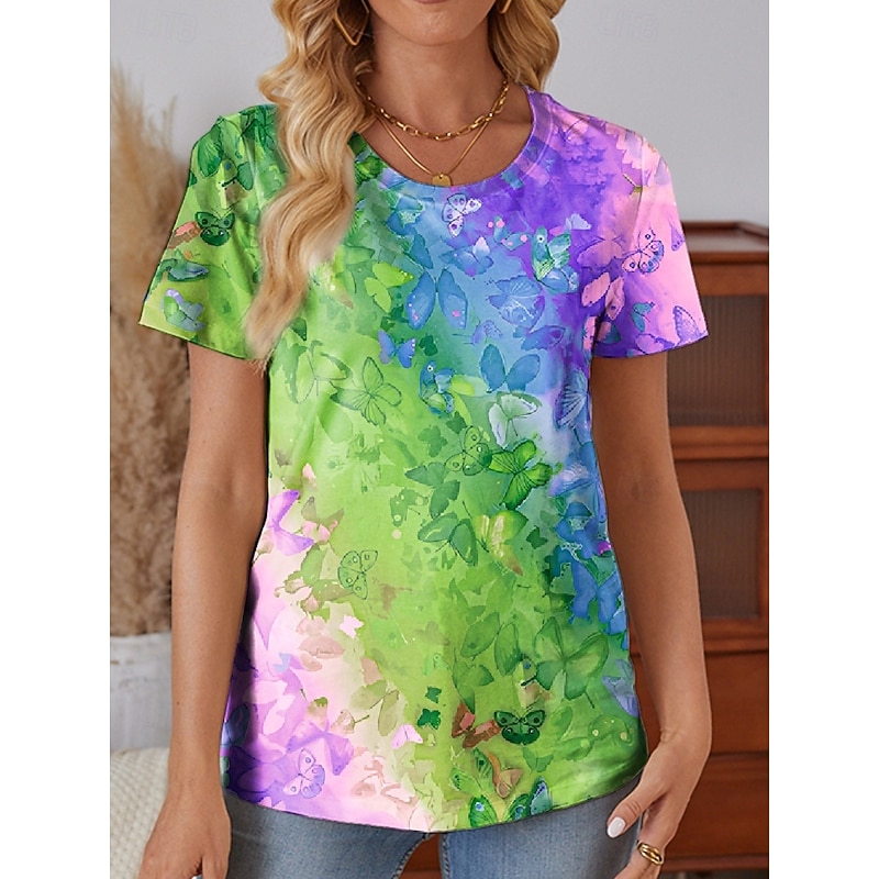 More information about Women's T Shirt Gradient Casual Short Sleeve Round Neck Regular Tops Daily Print Blue Purple Green Rainbow Summer