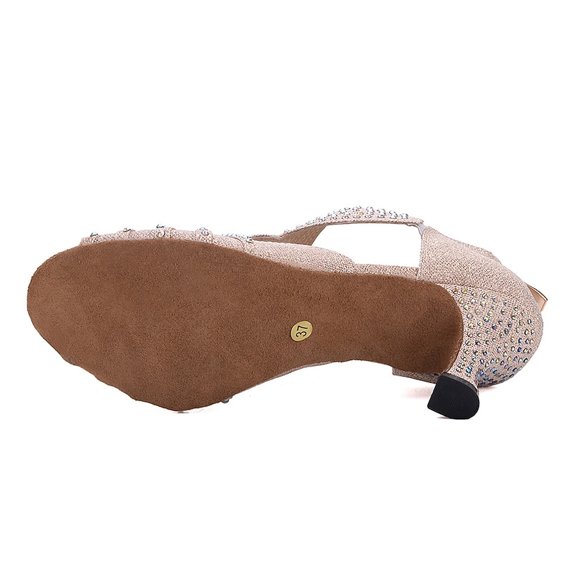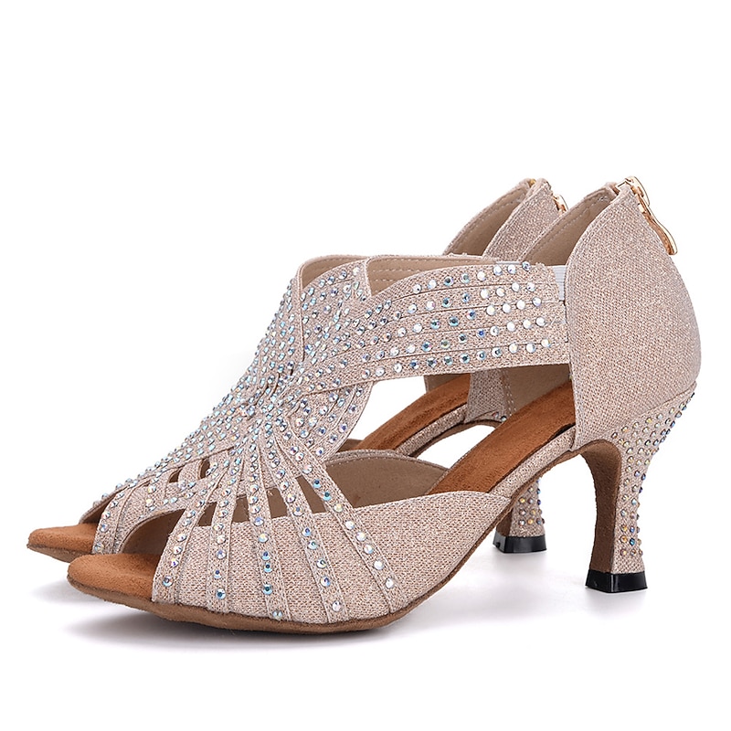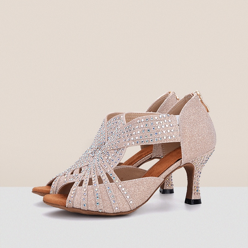 Highlights [Fabric] Crafted from high-quality elastic fabric, these dance shoes feature a suede lining that offers both durability and comfort. The glittery surface is embellished with rhinestones, providing a luxurious appearance that shines under the lights. [Fit] The shoes are designed with a secure medium heel, measuring 2.5 inches (6.3 cm), providing stability and ease of movement. A convenient zipper closure at the back ensures a snug fit for all-night dancing or special events. [Design Highlights] These elegant Latin dance shoes boast a strappy, open-toe design with dazzling rhinestone embellishments, accentuating a glamorous look. The flared heel offers a chic touch, enhancing both style and function. [Occasions] Perfect for performances, formal occasions, and dance events, these shoes allow for seamless transitions from the dance floor to any special celebration. Their glittery finish and jewel-like accents make them a sophisticated choice for those seeking an eye-catching ensemble. [Size Options] Available in a variety of sizes, ranging from US5 (EU35) to US9.5-10 (EU41), ensuring a fit for numerous preferences. With versatile color choices like gold, pink, black-white, and white/silver, these shoes can complement any wardrobe. These dance shoes combine elegant design and practical features, making them an essential addition for dancers or anyone looking to make a fashionable statement.