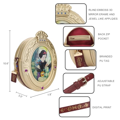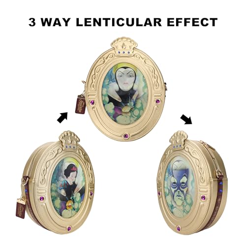 • CUSTOM DESIGN: This fun 3D crossbody bag has been custom-designed to resemble the Evil Queen's magic mirror - complete with embossed rhinestones and a three-way lenticular applique that shifts between images of Snow White, the Queen, and the mirror's face!