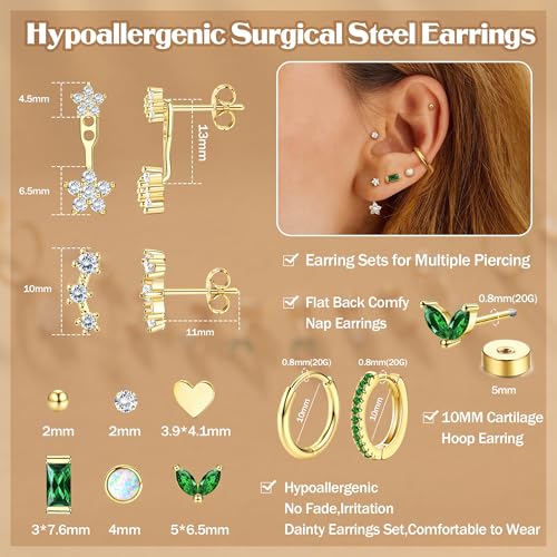 • Women Earrings Sets for Multiple Piercing: 10 Pairs 20G 14K Gold Hypoallergenic Multipack Cartilage Earring Stacks, 6 pairs flatback earrings, 2 pairs huggie hoop earrings,1 pair ear jacket and 1pair ear climber earrings, you can wear it any way you want