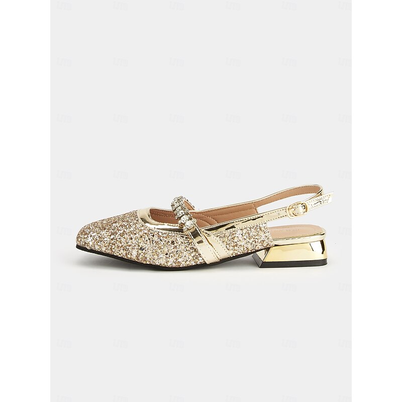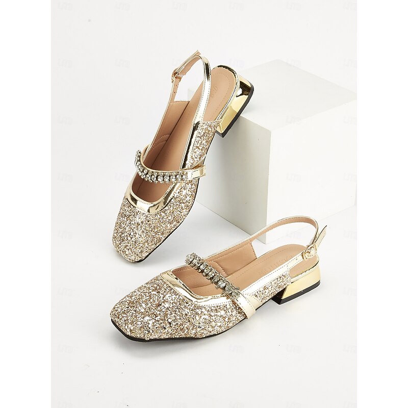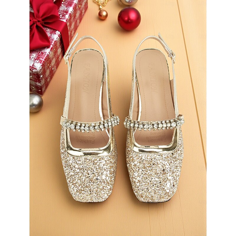 HOT ! Women's Gold Glitter Square Toe Low Heel Mary Jane Shoes - Rhinestone Strap Party Flats for Nightlife and Christmas Holiday Events