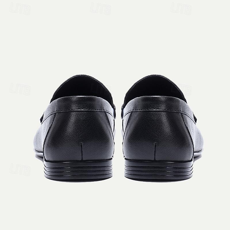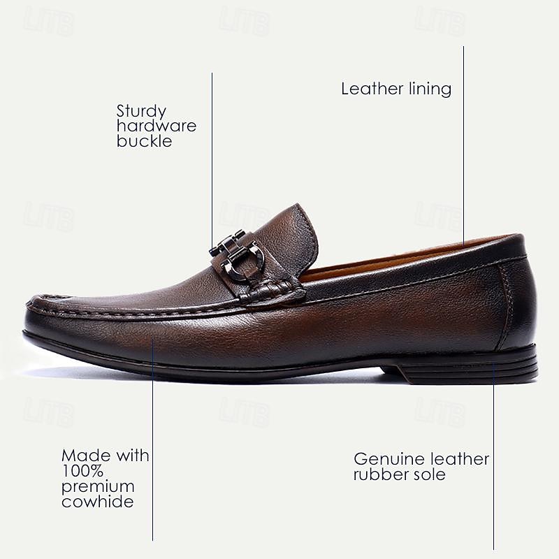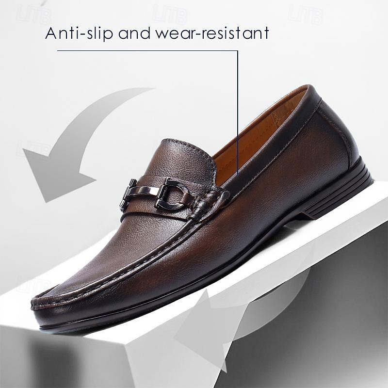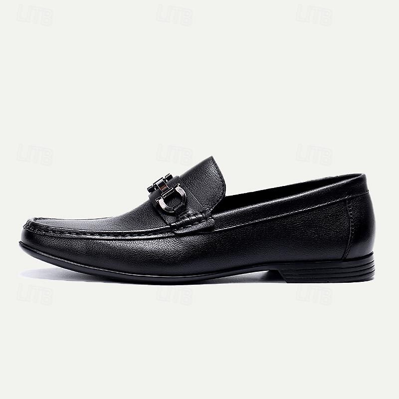 Highlights [Fabric] Expertly crafted using premium Italian full-grain cowhide leather, these men's loafers offer an unrivaled combination of durability and a sleek, sophisticated appearance. The richly textured leather surface delivers a luxurious finish, embodying class and elegance. [Fit] Designed with a classic slip-on style, these loafers ensure a comfortable fit with every wear. The round toe shape adds a timeless touch, making them a versatile addition to any wardrobe. [Design Highlights] These loafers feature a distinguished black metal buckle detail on the vamp, enhancing the overall elegance and modern appeal. The high-quality rubber outsole provides slip resistance, ensuring both style and safety when walking. [Occasions] Perfect for formal events, business meetings, and other sophisticated occasions. Whether you're attending an important conference or a classy dinner, these loafers add a touch of refinement to any outfit, seamlessly transitioning from day to night. [Size Range] Available in a wide range of sizes from US5/EU38/UK4 to US13/EU46/UK12, these loafers accommodate different foot sizes, offering a personalized fit for every gentleman.