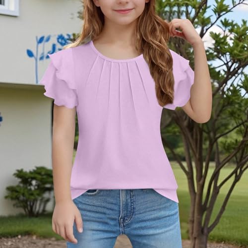 HOT ! Girls Ruffle Sleeve Top Short Sleeve T Shirts Plain Kids Summer Tshirt Pleated Crewneck Loose Soft Tee Aesthetic