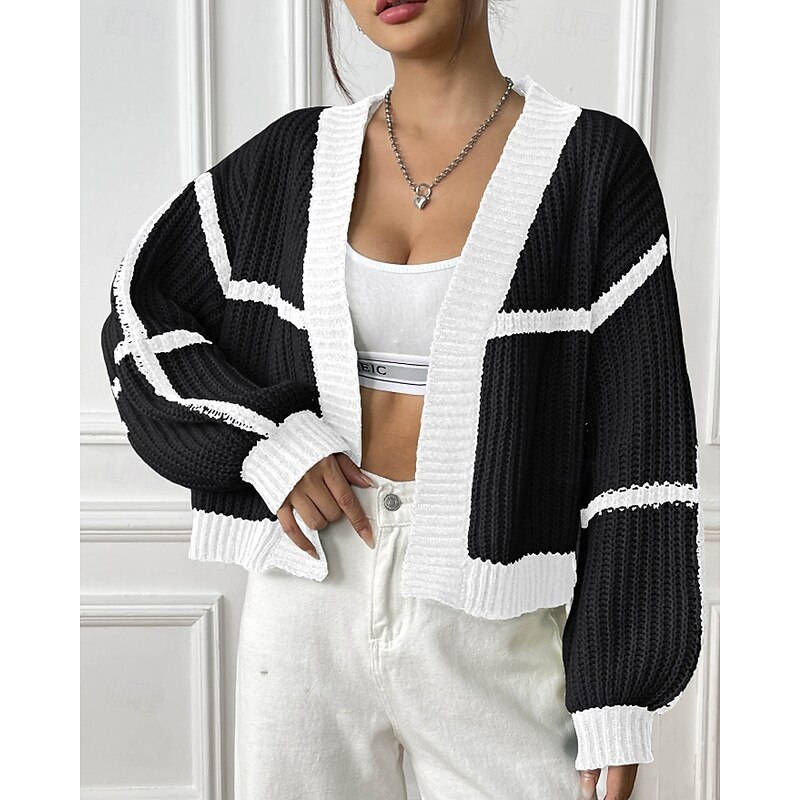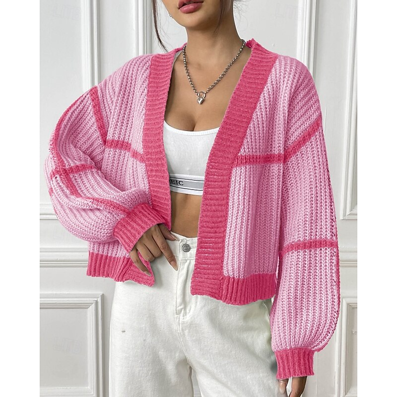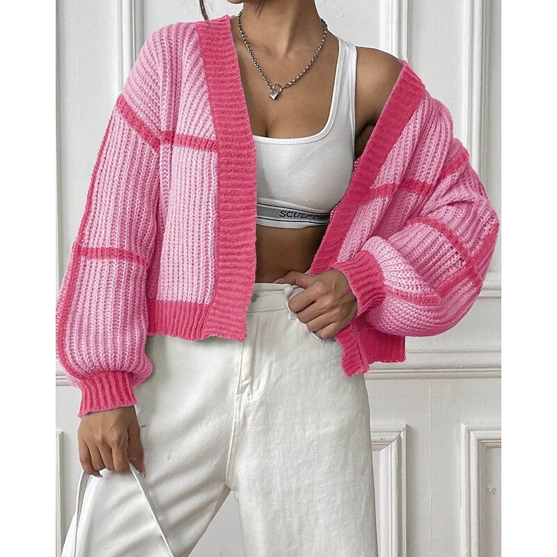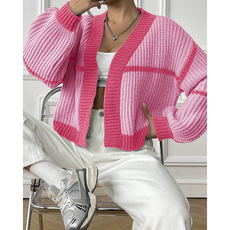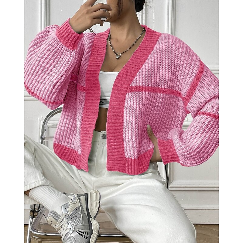 Women's Cardigan Fashion Color Block Ribbed Cowl Patchwork Knitted Long Sleeve Regular Tops Knit Holiday Going out Weekend Black Pink Fall 10