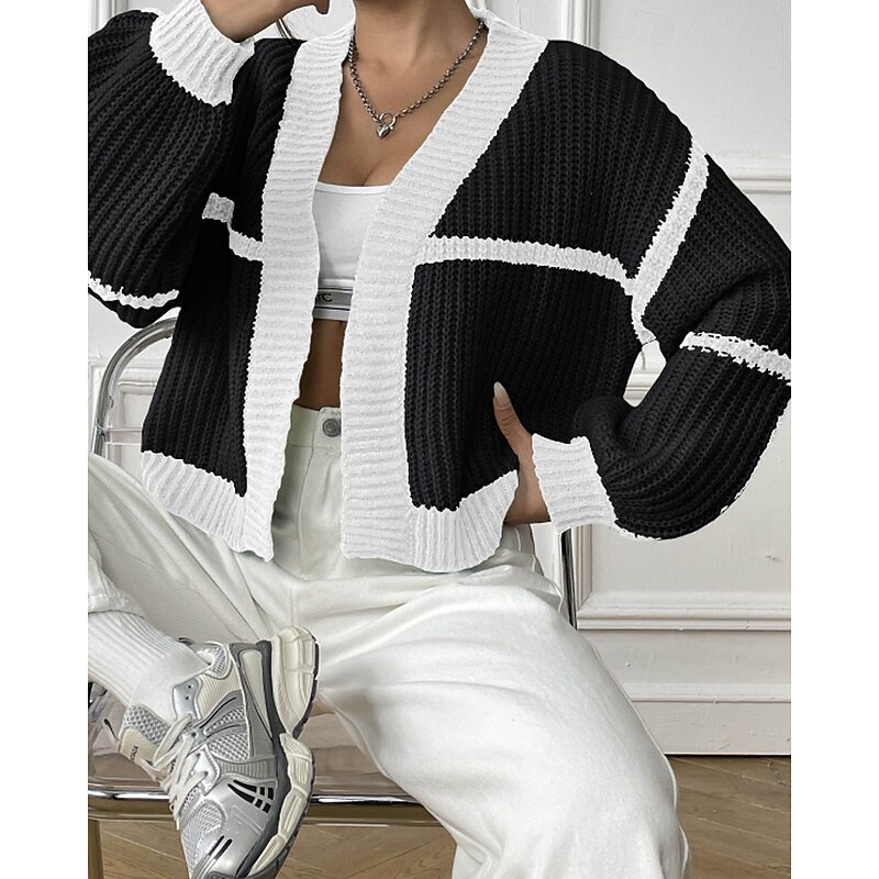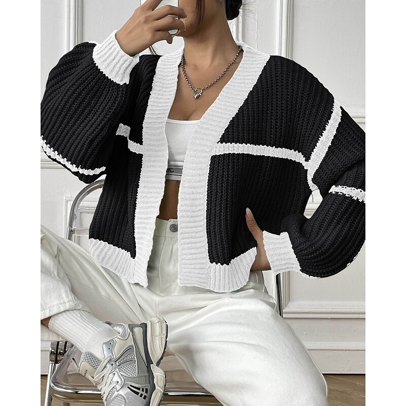Women's Cardigan Fashion Color Block Ribbed Cowl Patchwork Knitted Long Sleeve Regular Tops Knit Holiday Going out Weekend Black Pink Fall 12