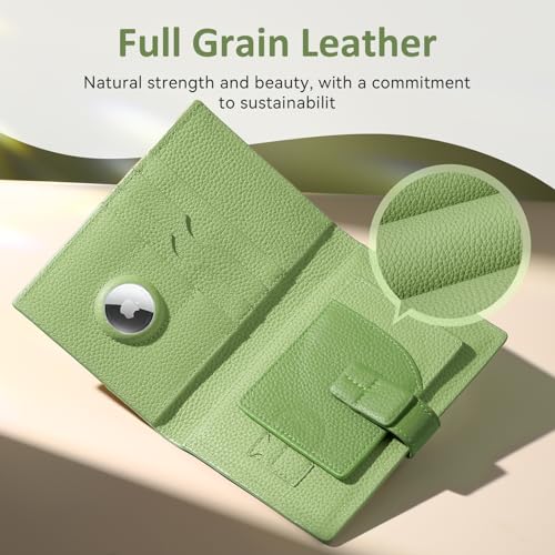 Full Grain Leather Passport Holder for Travel Women Men Passport Wallet with Airtag Slot RFID Blocking Travel Essentials Passport Cover Case Green