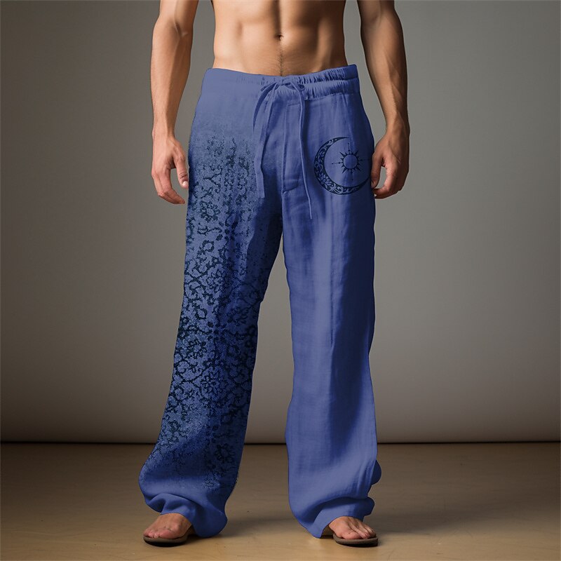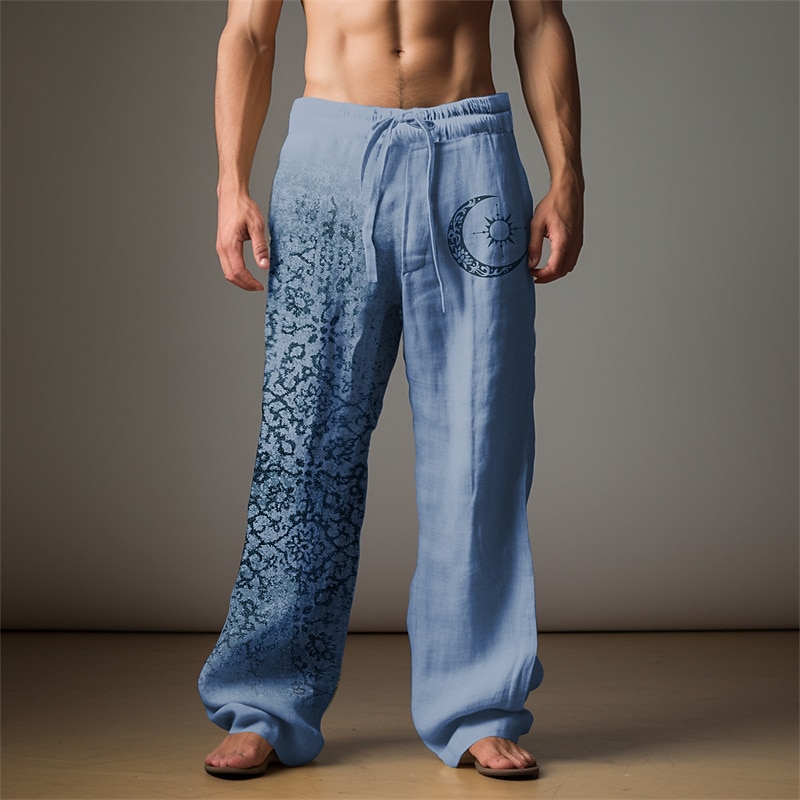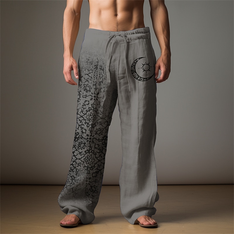 Crafted from a cotton linen blend, these Men's Graphic Moon Linen Pants provide breathable comfort and a natural texture, perfect for warmer seasons like spring and fall. The lightweight material ensures ease of movement and a relaxed feel for daily wear or vacation outings.