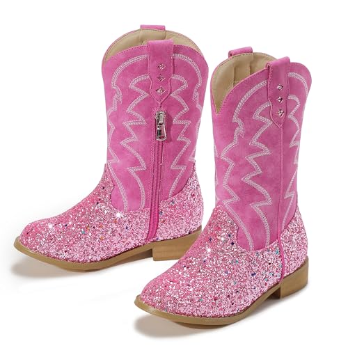 PANDANINJIA Girls Cowgirl Boots Mid Calf Sequin Cowboy Boots Toddler Little Big Kids Round Toe Western Riding Horse Shoes Booties 6