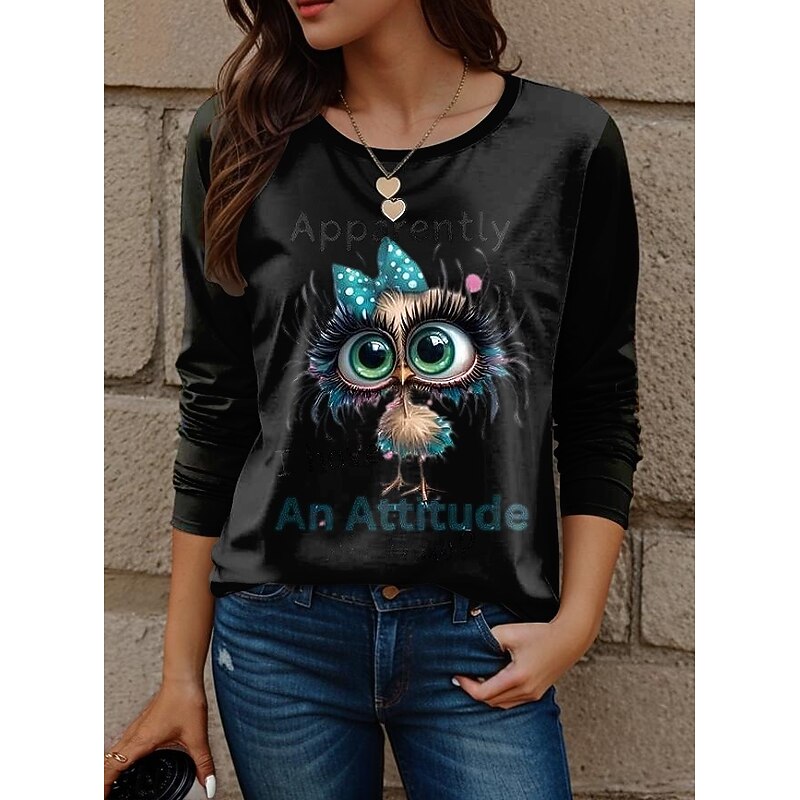 Women's T shirt Long Sleeve Crew Neck Long Sleeve Tunic Animal Letter Modern Casual Regular Tops Daily Weekend Print Black White Yellow Red Sky Blue Fall Winter Prefall 13