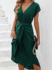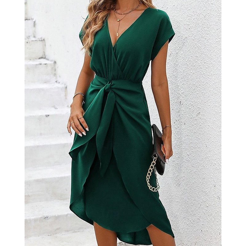 Highlights - Fall season essential - Made from high-quality polyester fabric - Stylish short sleeve design - Perfect for women's vacation wardrobe - Flattering sheath dress silhouette - Features trendy bow, split, and asymmetrical designs - Chic V neck neckline - Versatile midi dress length suitable for various occasions