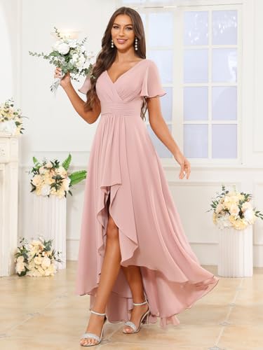 HOT ! Flutter Sleeve Chiffon Bridesmaid Dresses for Women V Neck Pleated Hi-Low Evening Formal Dress