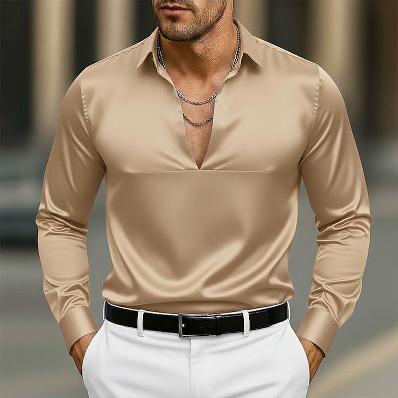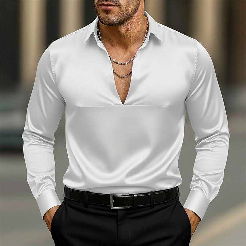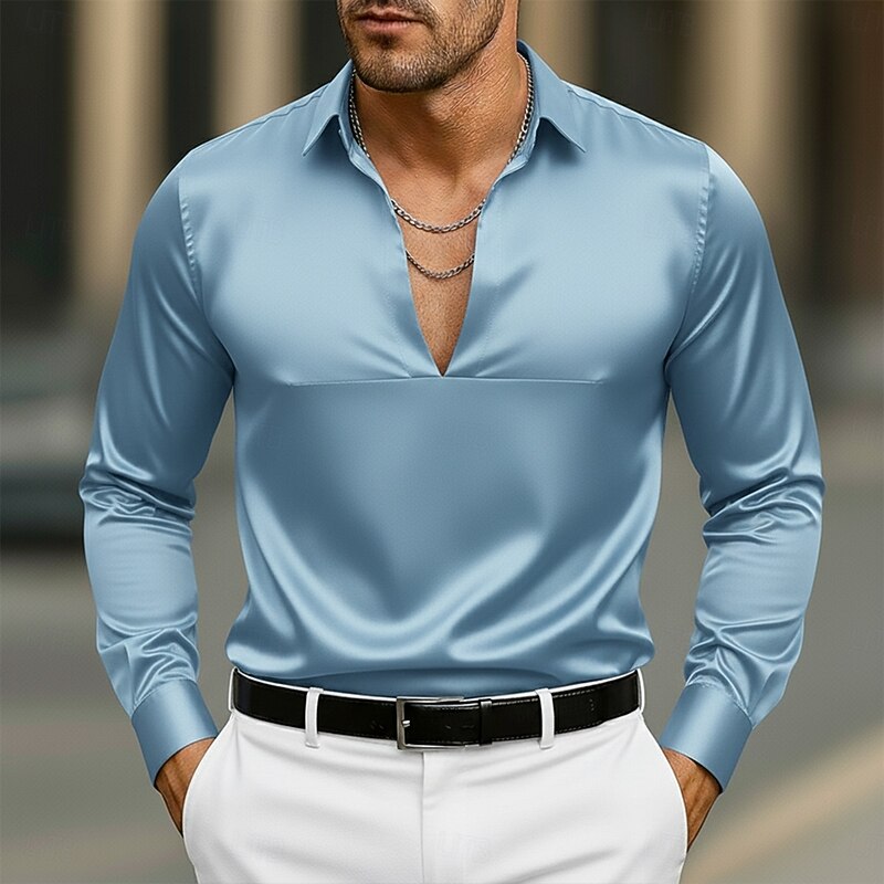 More information about Men's Shirt Satin Shirt Dress Shirt Casual Shirt Button Up Shirt Prom Shirt Plain Formal Wedding Light Blue Black White Navy Blue Long Sleeve V Neck All Seasons Clothing Apparel