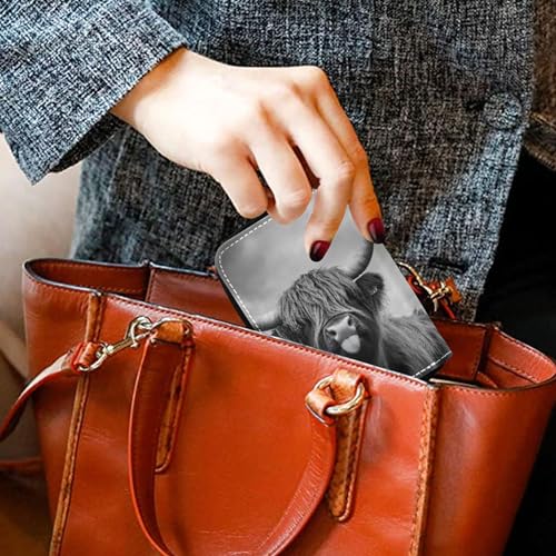 HOT ! Small Womens Wallet RFID Blocking Card Holder Cute Leather Zipper Coin Purse with Key Ring Mystic Highland Cow Monochrome