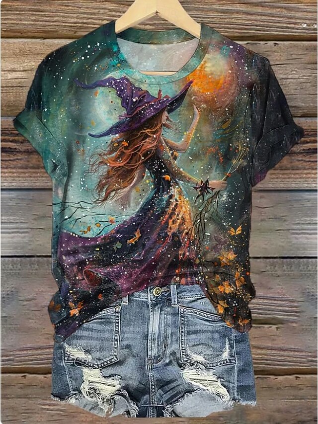 Halloween Women's T shirt Witch Graphic Vintage Stylish Classic Short Sleeve Crew Neck Round Neck Regular Tops Daily Weekend Print Black Dark Green Fuchsia Green Summer Spring Fall 1