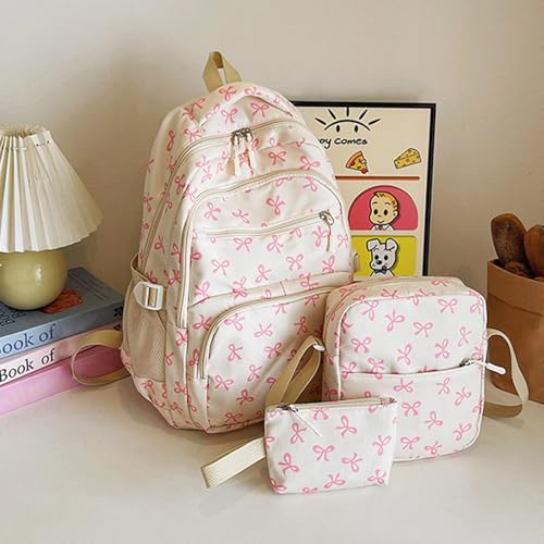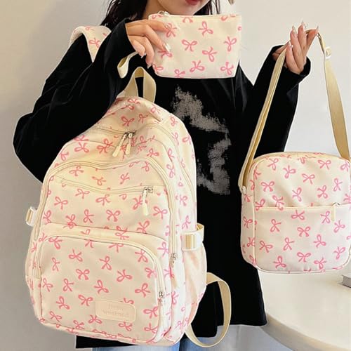 trending ! Pink Bow Backpack 3pcs Set,Coquette Cute Aesthetic Bow Backpack, Kawaii Nylon Backpack Set Large Capacity (Pink)