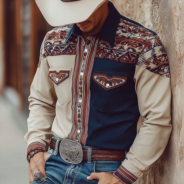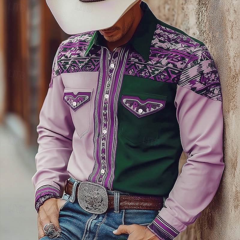 HOT ! Men's Geometric Aztec Ethnic Shirt Western Shirt Cowboy Shirt Long Sleeve Vintage Retro Outdoor Casual WorkWear Spring Fall Turndown Front Two Pockets Linen Like Shirt Button Up Shirts Pink Light