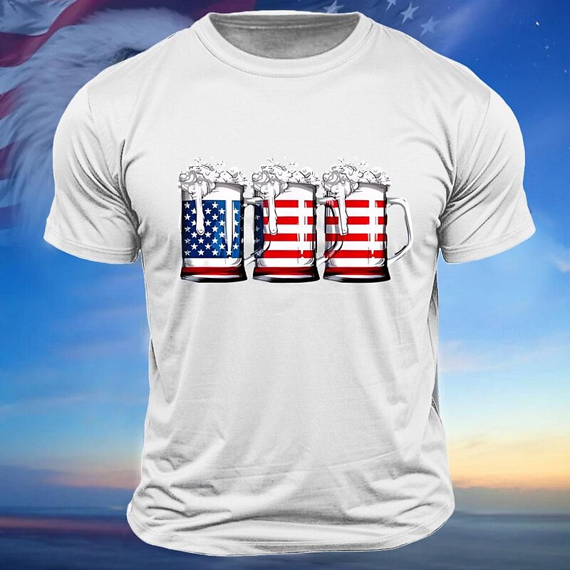 The t-shirt features a vibrant and fun graphic design on the front, showcasing three beer mugs creatively adorned with the American flag's stars and stripes. The striking use of red, white, and blue colors adds a touch of patriotic flair, perfect for those who enjoy displaying their national pride.