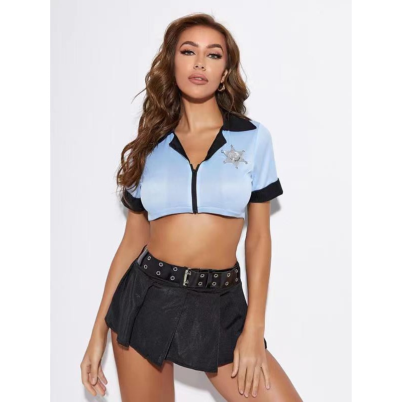 : The costume includes a light blue, short-sleeved crop top with a stylish black collar and a convenient front zipper closure, contributing to a chic and alluring look. The top is completed with a metallic police badge, enhancing its authentic appeal. The bottom consists of a black pleated mini skirt, designed to complement the top with its flirty aesthetic. A black belt with decorative handcuffs adds a striking element to the ensemble, perfect for making a bold statement. The costume is accessorized with a matching police cap, edgy high-heeled boots featuring buckle accents, and mirrored aviator sunglasses to complete the authoritative and daring look.