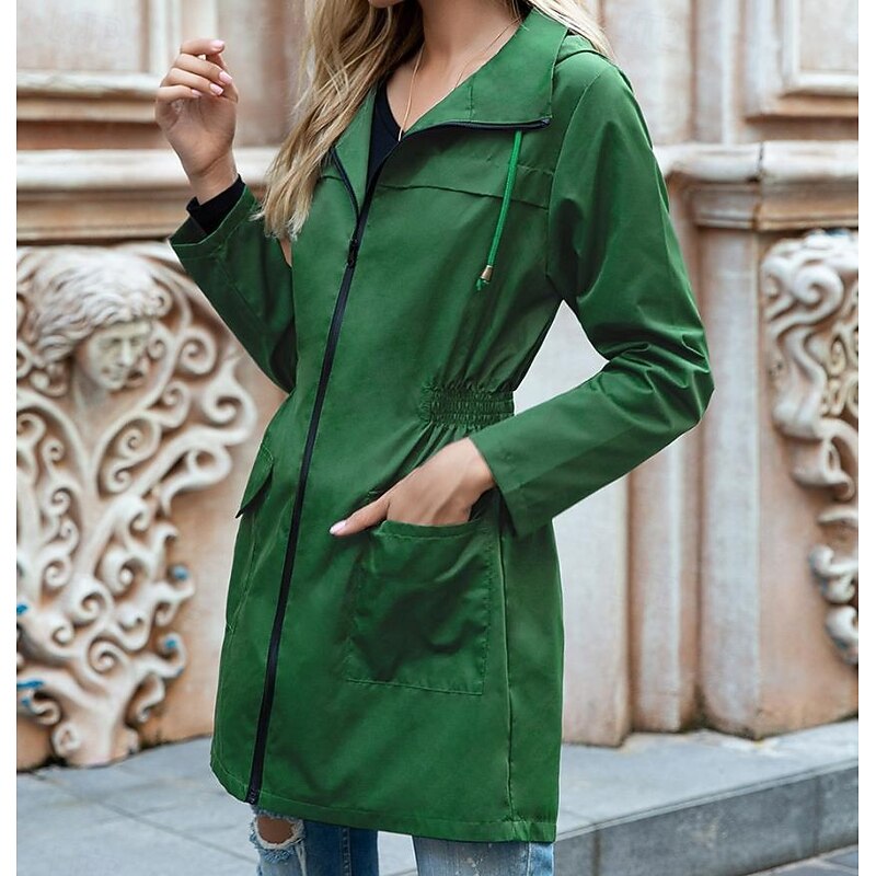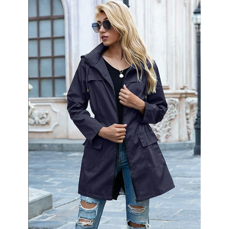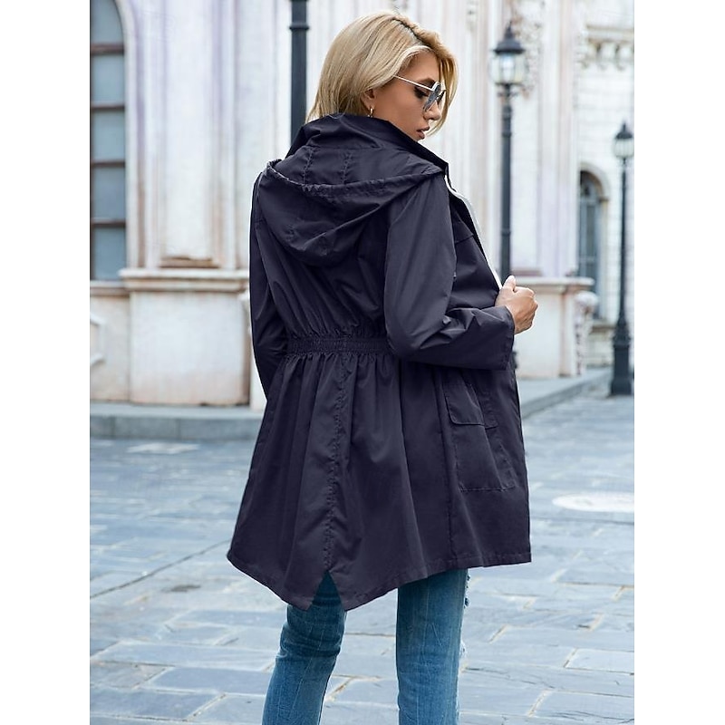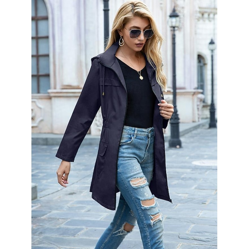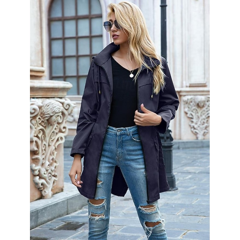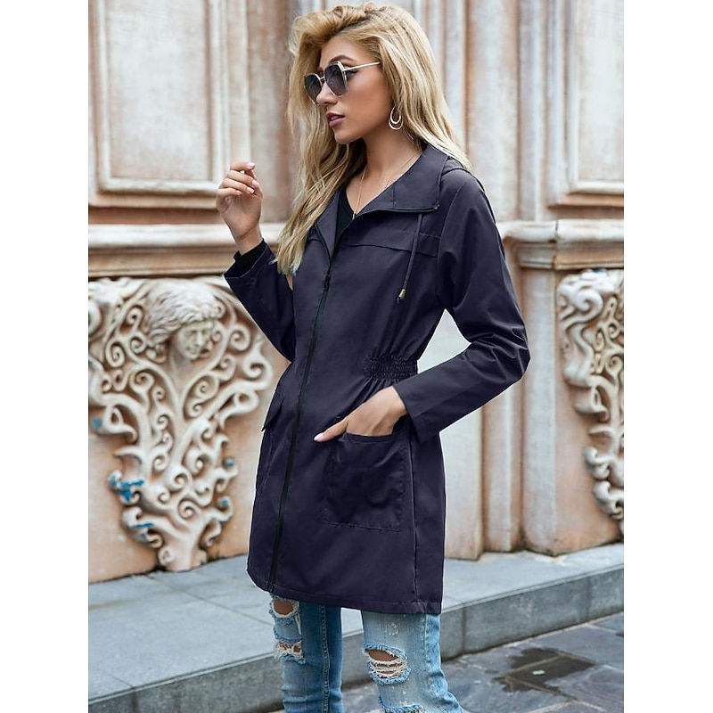 Highlights [Fabric] This women's casual jacket is crafted from high-quality polyester fabric, providing a lightweight yet durable feel. The material is water-resistant, offering protection against light rain and wind, making it perfect for the fall and winter seasons. [Fit] Designed with a loose fit, this jacket offers comfort and ease of movement, while the drawstring waist allows for a customizable silhouette to suit different body shapes. The long sleeves come with adjustable cuffs, further enhancing its adaptability and comfort. [Design Highlights] The jacket features a full-length zipper closure for practical wearability, complemented by a turndown neckline that adds a touch of classic elegance. Equipped with two spacious flap pockets, it conveniently holds your daily essentials. The solid color design makes it a versatile piece for any wardrobe. [Occasions] Ideal for daily wear and street style, this casual jacket is perfect for transitional weather. Whether you're heading out for a leisurely stroll or a casual outing with friends, its stylish yet functional design makes it an excellent choice for various occasions. [Size Range] Available in a wide range of sizes from S to XXL, this jacket is designed to cater to different body types, ensuring a comfortable fit for everyone.