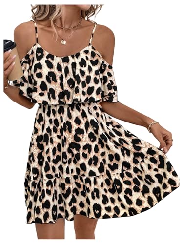 • Features: Leopard print, cold shoulder, spaghetti strap, cami dress, ruffle hem, high waisted, a line, flared mini length, flowy dress for women