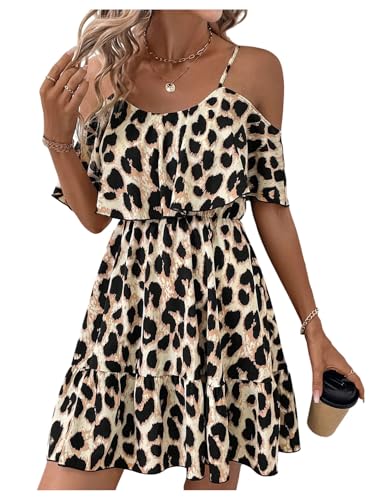 SweatyRocks Women's Leopard Print Cold Shoulder Short Sleeve Mini Dress Ruffle Hem High Waist Short Dresses 6