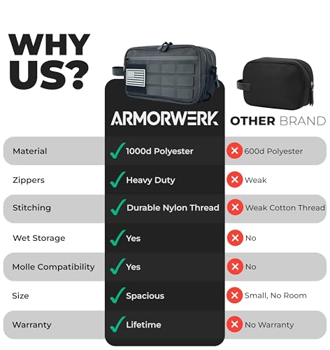 • TACTICAL MOLLE DESIGN — With a tough, tactical look, this toiletry bag stands out in style and function. Molle webbing on the side lets you easily attach extra pouches or gear for added storage, while the included American flag patch adds a personal, patriotic touch.
