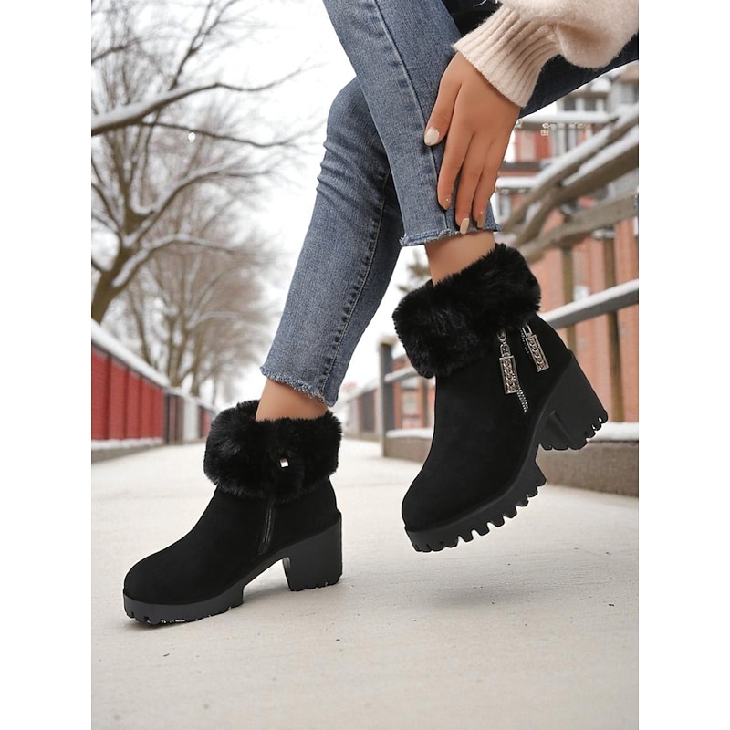 HOT ! Women's Black Faux Suede Fur-Lined Ankle Boots, Warm Zip-Up Chunky Heel Winter Booties for Snow, Outdoor Wear & Christmas Outfits