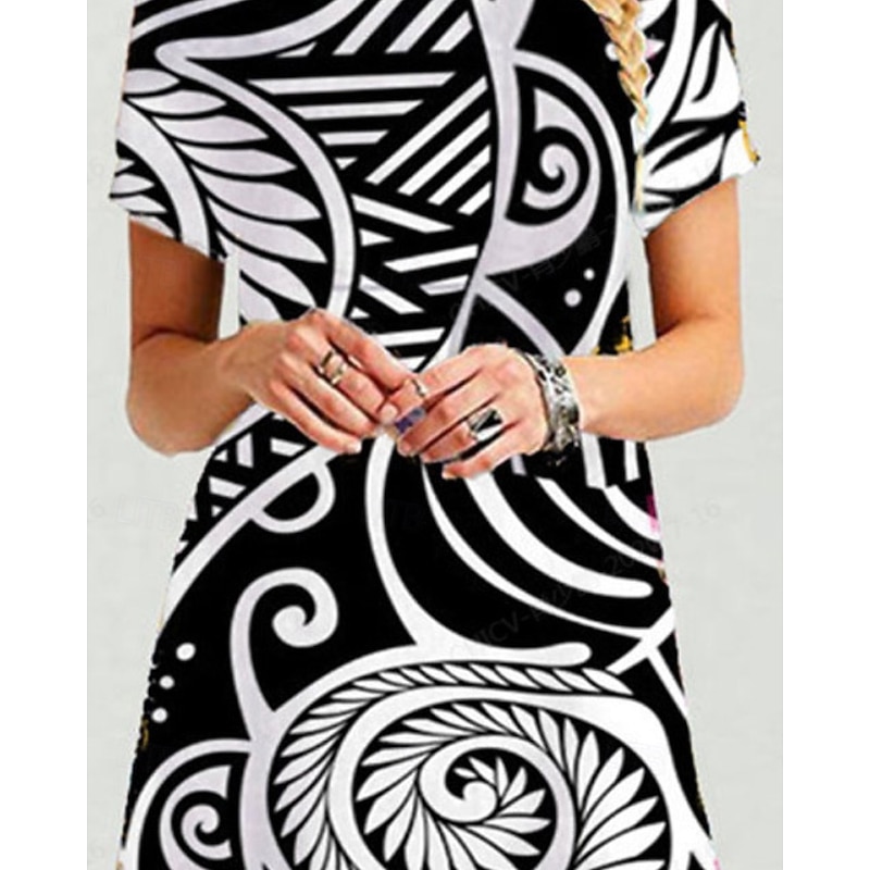 Highlights - Stay cool and stylish all summer long with this classic polyester dress - Perfect for daily wear or vacation adventures - Features a trendy geometric print design - Short sleeves and a mini dress length for a comfortable and chic look - Flattering crew neckline for a polished finish