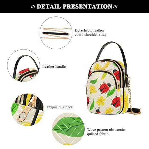 Womens Shoulder Handbag Cute Cartoon Ladybugs Floral Quilted Chain Strap Phone Wallet Handbag Cute Zipper Lady Crossbody Bag, 5.9" × 8.3" × 3.1" 6