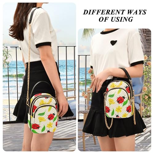 Womens Shoulder Handbag Cute Cartoon Ladybugs Floral Quilted Chain Strap Phone Wallet Handbag Cute Zipper Lady Crossbody Bag, 5.9" × 8.3" × 3.1" 2